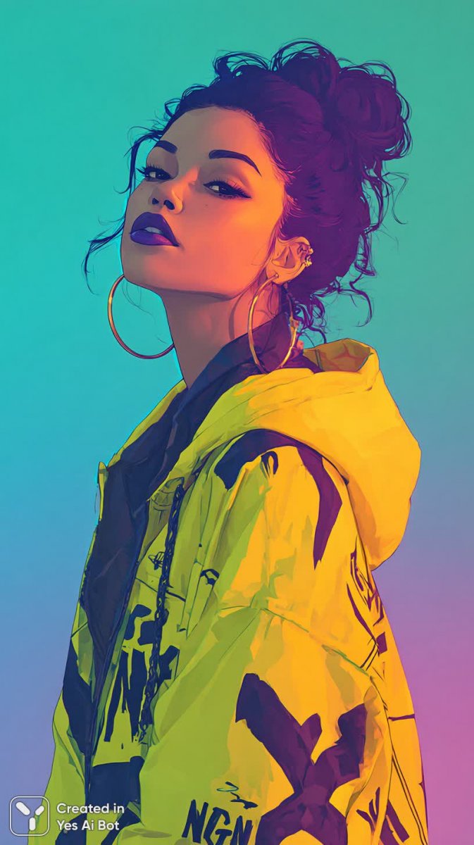 Яркий портрет молодой женщины, воплощающей дерзкий и современный стиль. Ее волосы, окрашенные в огненно-красный неоновый цвет, собраны в небрежный пучок, создавая ощущение непринужденной элегантности. На ней – объемная толстовка кислотно-желтого цвета с графическими элементами черного цвета, подчеркивающая ее индивидуальность и бунтарский дух. Большие кольца в ушах добавляют образу акцент, а смелая фиолетовая помада завершает яркий макияж, придавая уверенности взгляду. Она смотрит прямо в камеру с бесстрашием и самодостаточностью, излучая энергию и харизму. За ней – взрывная смесь ярких цветов, создающая динамичный фон, который лишь усиливает эффект от ее образа. Профессиональная фотография запечатлела момент уверенности и стиля, демонстрируя смелое сочетание цветов и фактур. Это изображение – манифест современной девушки, которая не боится быть собой и выражать свою индивидуальность через яркий стиль и дерзкий взгляд. Она - воплощение энергии, уверенности и неповторимости, запечатленное в этом впечатляющем портрете. Фотография излучает позитив и заряжает энергией, передавая атмосферу смелости и креатива