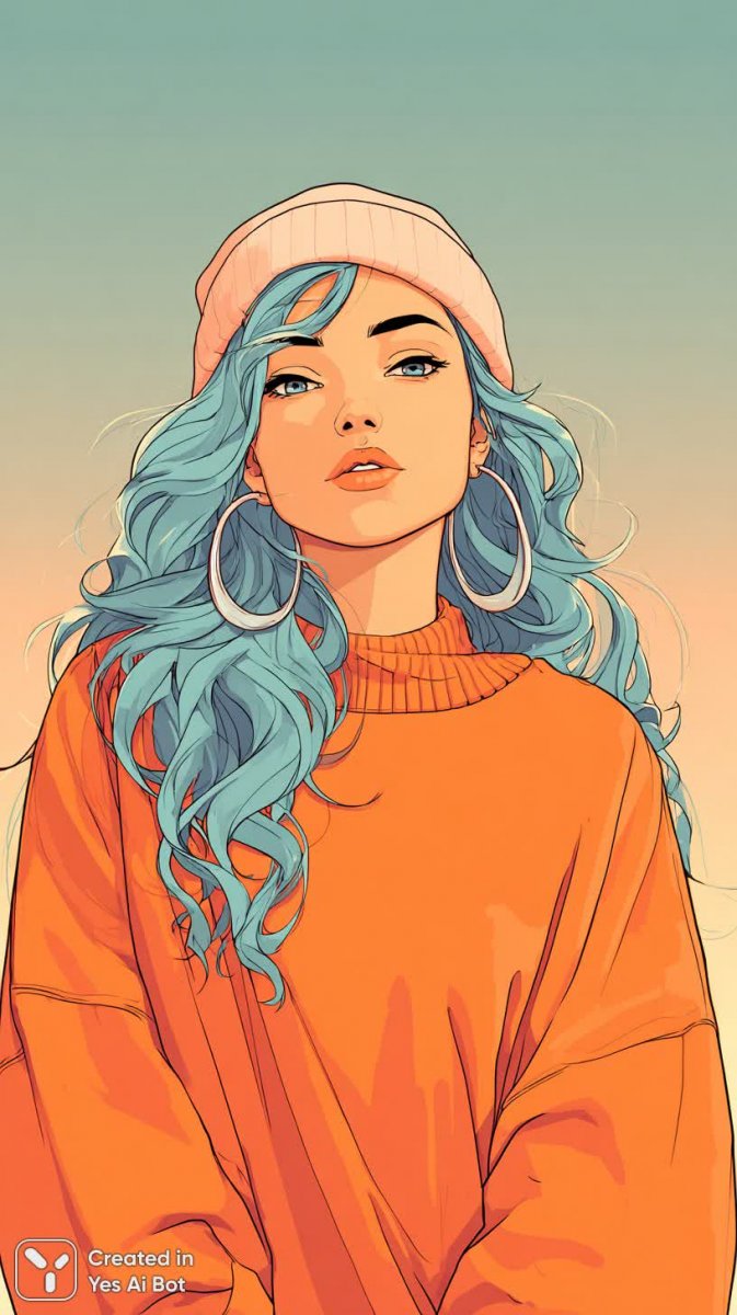 Яркая и дерзкая девушка в нежном образе привлекает внимание своей необычной внешностью. Длинные волосы насыщенного бирюзового цвета ниспадают мягкими волнами, создавая эффектный контраст с пастельно-розовой шапочкой на голове. Объемный свитер оранжевого цвета добавляет образу игривости и динамики, а массивные серебряные серьги подчеркивают индивидуальность. Выразительный макияж в теплых оранжевых тонах акцентирует взгляд и придает лицу загадочности. Серьезное выражение лица, прямой взгляд в камеру создают ощущение уверенности и силы характера. Фон выполнен в виде мягкого градиента от синего к розовому, что добавляет снимку глубины и воздушности. Профессиональная фотография демонстрирует мастерство фотографа, улавливающего мельчайшие детали и передающего атмосферу момента. Это портрет девушки, сочетающей в себе нежность и бунтарский дух, классическую красоту и смелые эксперименты с цветом и стилем. Она словно сошла со страниц модного журнала, воплощая собой современную интерпретацию женственности и индивидуальности. Образ запоминается своей оригинальностью и вызывает желание узнать историю этой яркой личности. Фотография излучает энергию и позитив, оставляя неизгладимое впечатление
