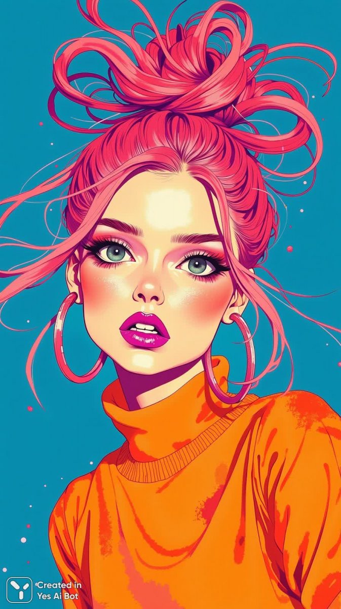 Портрет молодой женщины, выполненный в ярком неоновом стиле, излучает энергию и игривое настроение. Девушка с розовыми волосами, уложенными в небрежный пучок, одета в просторный оранжевый свитер и украшена крупными серьгами-кольцами. Макияж акцентирует внимание на губах с насыщенной фиолетовой помадой и выразительном взгляде благодаря смелой подводке. Ее взгляд, обращенный прямо в камеру с легкой ухмылкой, вызывает позитивные эмоции. Фон – однотонный темно-синий цвет – контрастирует с ярким образом модели, позволяя полностью сосредоточиться на ней. Вся композиция передает атмосферу свободы, творчества и оптимизма, подчеркивая уверенность в себе и готовность к новым приключениям. Картина пронизана духом веселья и безграничной энергии, создавая запоминающийся и вдохновляющий образ, словно приглашающий разделить волну позитива и нестандартного мышления. Изображение сгенерировано нейросетью Flux.ArtFusion с использованием стиля акварели, иллюстрации и LineArt.