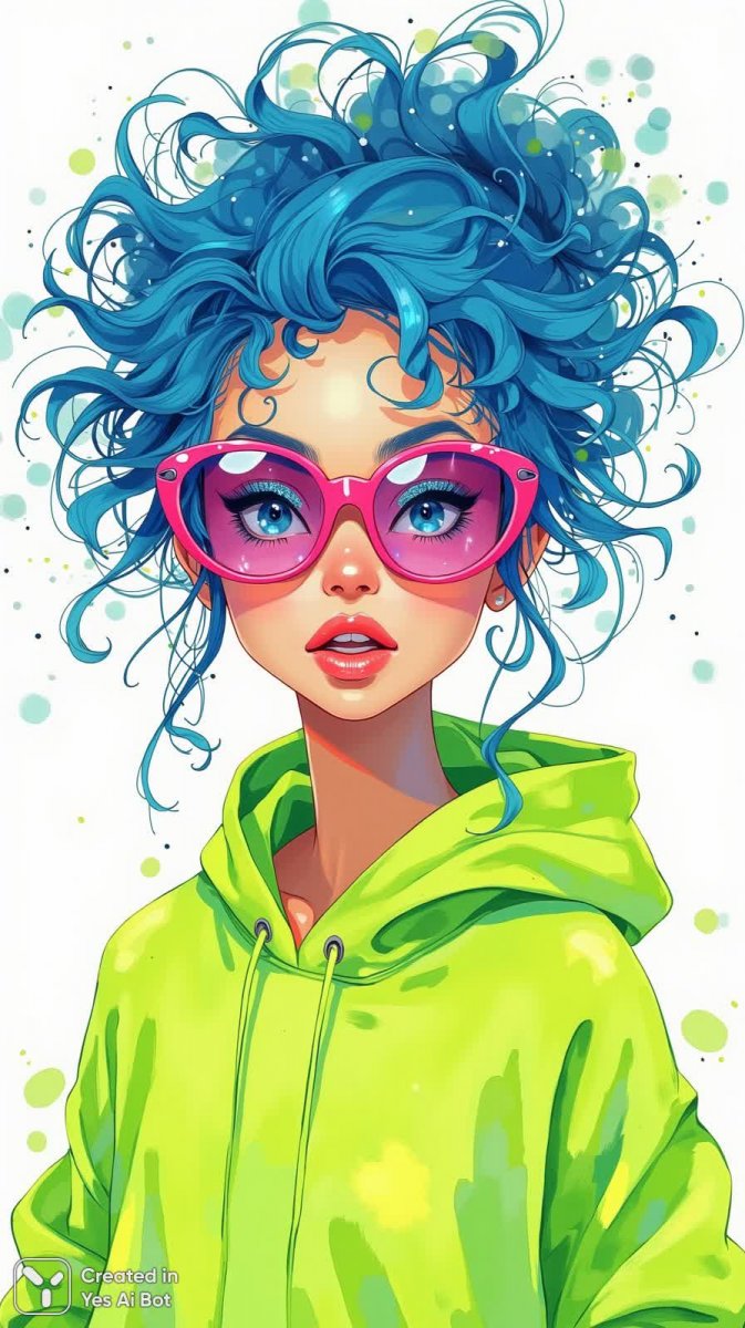 young woman with wild blue curly hair, wearing neon green oversized hoodie and large pink sunglasses, bold makeup with glittering blue and yellow accents, playful expression looking directly at camera, BG is solid white color, vibrant and fresh mood.