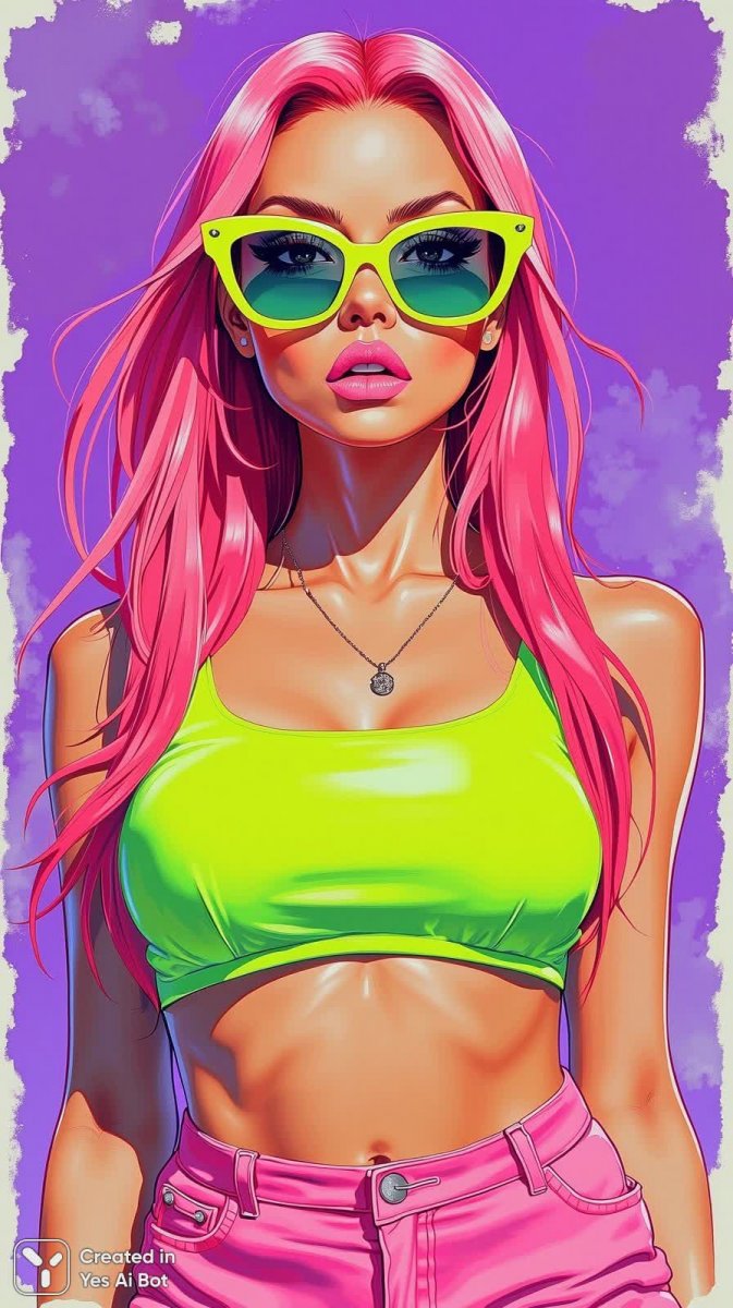 Яркий портрет молодой девушки в дерзком и запоминающемся образе. Длинные розовые волосы контрастируют с массивными желтыми солнцезащитными очками, а неоново-зеленый топ и короткие розовые шорты подчеркивают игривый стиль. Выразительный макияж с блестящими тенями и яркой розовой помадой добавляет драматизма, создавая эффектный акцент на лице. Серьезное выражение лица и прямой взгляд в камеру придают портрету уверенности и силы. Задний план насыщенного фиолетового цвета усиливает ощущение глубины и создает идеальную основу для ярких цветов. Этот образ излучает энергию, смелость и индивидуальность, сочетая в себе элементы моды, красоты и современного искусства. Он словно воплощает собой дух молодости, свободы и самовыражения, притягивая взгляд своей необычностью и вызывая восхищение. Контрастные цвета и динамичная композиция делают этот портрет по-настоящему запоминающимся произведением, полным жизни и позитива. Это визуальная феерия, которая не оставляет равнодушным и заряжает энергией