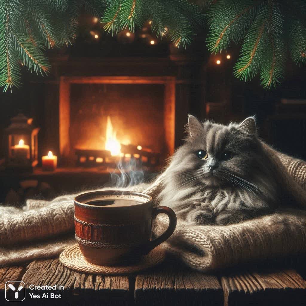 Серый котик сидит, укутанный пледом. Рядом с ним стоит кружка с горячим кофе. На заднем плане виден камин и ветки ели. Атмосфера теплая и позитивная.