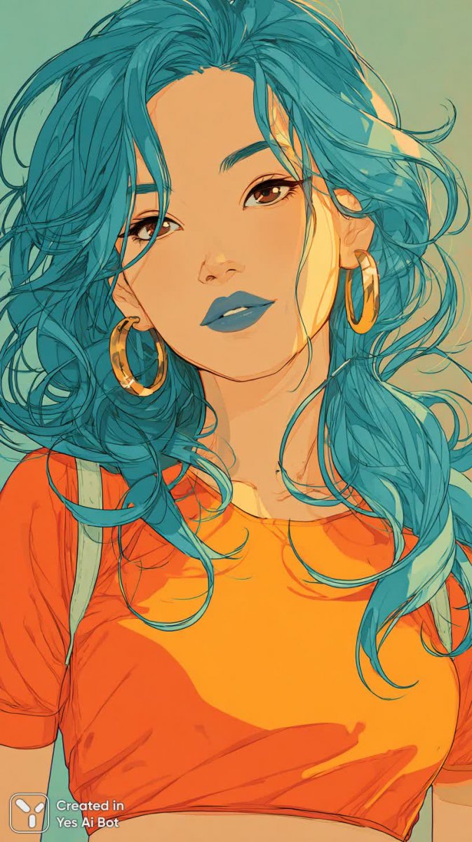 Яркий портрет молодой женщины, чья прическа представляет собой дерзкое заявление с помощью насыщенного бирюзового цвета волос. Образ дополнен смелым сочетанием неоново-оранжевого кроп-топа и массивных серебряных колец в ушах, подчеркнутых золотыми цепочками, добавляющими нотку гламура. Макияж выполнен в драматичном стиле с акцентом на губы, окрашенные в яркий пурпурный цвет, создавая эффектный контраст. Волосы, уложенные легкими волнами, свободно ниспадают на плечи, привнося ощущение непринужденной элегантности. Фон представляет собой градиент из розового и зеленого цветов, формирующий неоновую атмосферу, которая идеально сочетается с общей эстетикой портрета. Этот образ излучает уверенность, креативность и бунтарский дух, демонстрируя смелое самовыражение через яркие цвета и модные аксессуары. Портрет запечатлевает момент энергии и индивидуальности, представляя собой визуальный гимн современному стилю и смелым решениям в моде и макияже. Яркое освещение подчеркивает текстуру волос и кожи, а насыщенные оттенки создают ощущение глубины и динамичности. В целом, работа представляет собой захватывающий взгляд на красоту и уверенность современной женщины, выраженную через яркие визуальные элементы