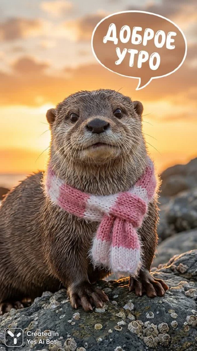 Утреннее приветствие от очаровательного выхухоля! Этот восхитительный персонаж, словно сошедший с доброй сказки, излучает позитив и безмятежность. На нём уютный розовый свитер и мягкие белые штаны – идеальный наряд для встречи нового дня. Выхухоль стоит на серых камнях, а за ним раскинулся нежный закат, окрашивающий небо в тёплые тона. Мягкий свет подчёркивает его игривую улыбку и пушистый мех, создавая ощущение тепла и уюта. Кажется, будто он готов подарить вам частичку своего хорошего настроения. Эта милая иллюстрация наполнит ваш день радостью и позитивом, напоминая о прекрасных моментах и простых удовольствиях жизни. Это не просто рисунок – это воплощение оптимизма и дружелюбия, приглашение к улыбке и новым свершениям. Наблюдая за ним, хочется пожелать всем доброго утра и замечательного дня, полного приятных сюрпризов и вдохновляющих событий. Он словно маленький пушистый талисман удачи, готовый согреть своим присутствием в любую погоду