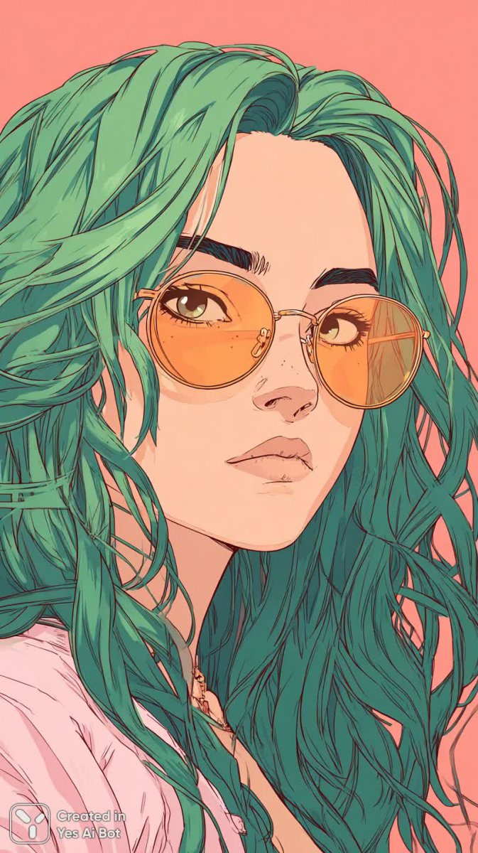Яркий и дерзкий портрет молодой женщины с необычным образом. Ее волосы насыщенного изумрудного цвета ниспадают мягкими волнами, создавая эффектную прическу. Крупные солнцезащитные очки в золотой оправе с оранжевыми линзами добавляют образу загадочности и стиля. Лицо повернуто вбок, взгляд серьезный и прямой – камера ловит момент уверенности и силы. Фон насыщенного розового цвета усиливает контраст и создает атмосферу неонового сияния. Вся композиция пронизана смелостью и современностью, передавая настроение бунтарства и индивидуальности. Это визуальное воплощение дерзкого характера и модных тенденций, сочетающее в себе яркие цвета и четкий акцент на выразительном взгляде. Картина излучает энергию молодости и непоколебимости, являясь прекрасным примером смелого самовыражения через стиль и образ. Контраст между нежным оттенком волос и насыщенным розовым фоном подчеркивает силу и решительность модели, делая портрет запоминающимся и эффектным