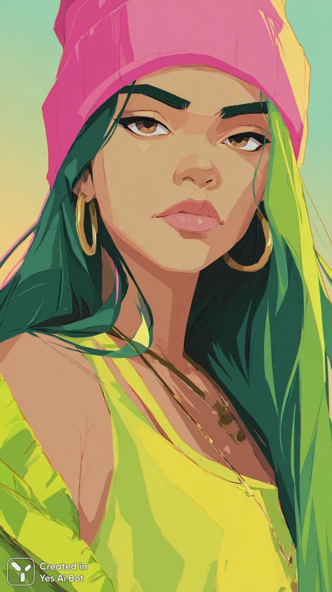 Яркий портрет молодой женщины, воплощающий дерзкую индивидуальность и смелое сочетание цветов. Длинные, насыщенно-зеленые волосы служат эффектным контрастом к ярко-розовой шапочке и кардигану неоново-зеленого цвета, дополненному желтым кроп-топом. Аксессуары добавляют образу завершенность: крупные серьги-кольца привлекают внимание, а смелый макияж с темным подводом для глаз и розово-бежевой помадой подчеркивает выразительность взгляда. Фон представляет собой градиент из розового и желтого цветов, создавая ощущение неоновой вспышки и динамичной атмосферы. Кажется, будто фотограф запечатлел момент энергии и уверенности в себе, играющий с яркими цветами и смелыми решениями в стиле. Этот образ – манифест оригинальности, призывающий не бояться экспериментировать и выражать свою уникальность через моду и красоту. Он излучает позитив и вдохновляет на творчество, демонстрируя силу самовыражения и любви к нестандартным решениям. Яркие цвета подчеркивают молодость и беззаботность, создавая ощущение праздника и свободы. Портрет представляет собой визуальную оду смелости и красоте в ее самых разнообразных проявлениях