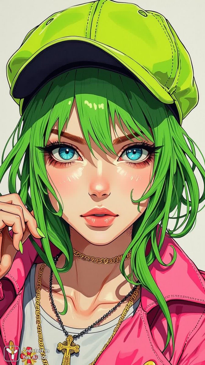 close-up portrait of young woman with vibrant green hair and blue eyes, wearing a neon green baseball cap and black beret, holding a pink jacket over shoulder, gold necklace featuring cross pendant visible, hair falling over shoulders, bold dramatic makeup, bg blurred, neon colors.