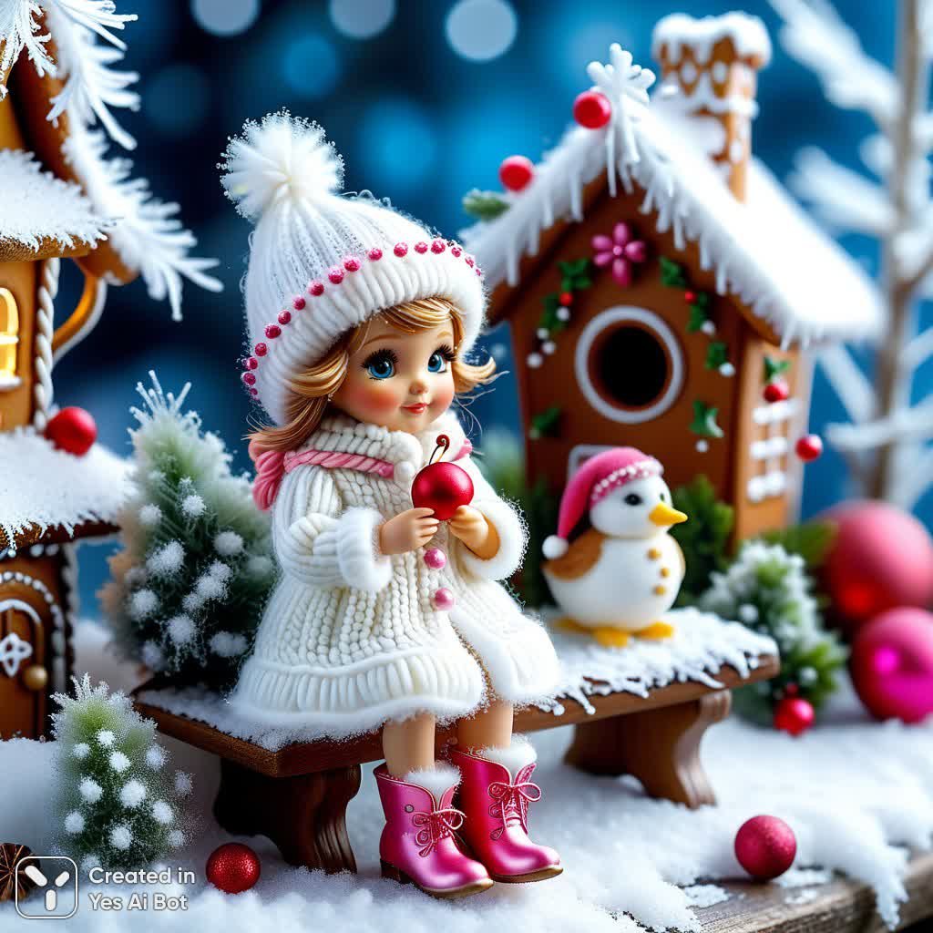 микро-мир на фоне рождество зима прянечные домики, снег.3D-эффект беленький микро. из пуха и махер, глазки, реснички, смех .микроэльф бебе вязан.розовые рюши шубка шапка из пуха одуванчика, на ногах ботинки, подарки игрушки нарядно иней .камушки, река мох и ягоды,нарядная елка игрушки иней гипер.сидит на лавочке, на руке птички снигери.смех. заморозки, фентази, красиво. В стиле художника Ли Богл, шебби-шик