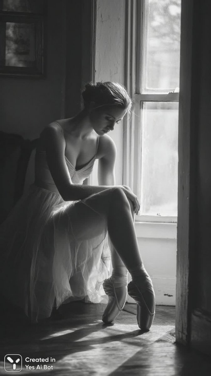 black and white photograph of a young ballerina tying her pointe shoes in a quiet corner, wearing a soft grey wrap and a delicate dress, thoughtful look on her face as she gazes down, BG is softly illuminated with natural light coming from a nearby window, overall mood is introspective and calm, photo quality: high resolution, camera: Canon EOS-1D X Mark III, lens: 24mm f/1.4, shooting angle: close-up, shooting style: documentary.