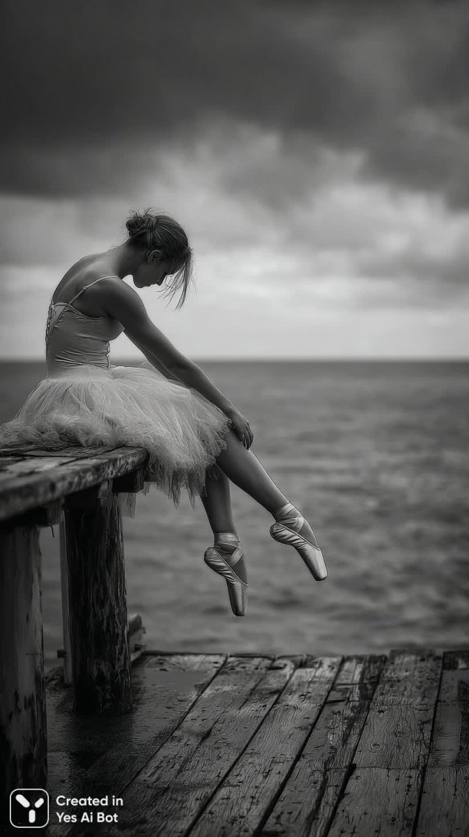 Запечатлённый в завораживающей черно-белой палитре, этот образ повествует о хрупкости и стойкости человеческого духа перед лицом стихии. В центре композиции – балерина, восседающая на старой деревянной пристани, обращенной к бушующему морю. Её изношенное белое платье и потрепанные пуанты с оборванными лентами служат символом утраты и уязвимости, подчеркивая контраст между нежной красотой танцовщицы и суровой мощью природы. Камера Canon EOS R6 Mark II с объективом 24-70mm f/2.8 мастерски передает игру света и тени, акцентируя драматизм момента и создавая ощущение грядущей бури. Изображение пронизано глубоким чувством меланхолии, но одновременно излучает надежду – в глазах балерины читается не только печаль, но и непоколебимая воля к жизни, несмотря на все трудности. Пристань, как символ перехода, соединяет мир танца и искусства с безжалостной реальностью океана. В этом визуальном повествовании переплетаются темы утраты, стойкости, красоты и надежды, создавая мощное эмоциональное воздействие на зрителя. Каждая деталь – от текстуры дерева до волн, разбивающихся о пирс – работает на создание единой, гармоничной картины, которая заставляет задуматься о бренности бытия и силе человеческого духа. Это не просто фотография, это поэма в черно-белых тонах, повествующая о красоте, скрытой в печали и надежде