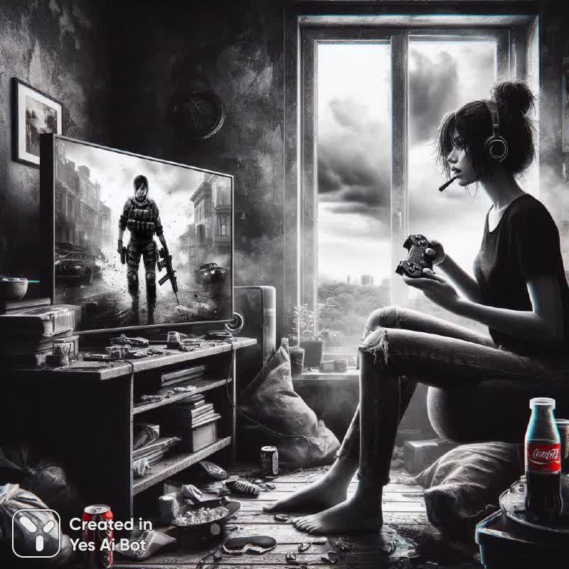 Интенсивный черно-белый портрет молодой геймерши, полностью погруженной в виртуальный мир. Комната отражает хаос и бессонные ночи за компьютером: разбросанная одежда, пустые упаковки от чипсов и банки из-под Coca-Cola создают атмосферу сосредоточенности и одержимости игрой. Героиня с короткой растрепанной стрижкой и серьезным выражением лица крепко держит джойстик, ее взгляд прикован к экрану, где разворачивается динамичная шутерная игра. Контраст между мрачной, захламленной комнатой и светлым, цветным пейзажем за окном – голубым небом и зелеными деревьями – подчеркивает отчуждение и погружение в альтернативную реальность, разделяя виртуальное и физическое существование. Изображение передает напряжение и адреналин игрового процесса, а также одиночество человека, выбирающего цифровой мир вместо окружающего его пространства. Визуальный акцент сделан на высокой контрастности, что усиливает драматизм сцены и подчеркивает сосредоточенность геймерши на достижении своей цели в виртуальной вселенной. Картина словно запечатлела момент абсолютной концентрации, когда реальность отступает перед захватывающей игрой