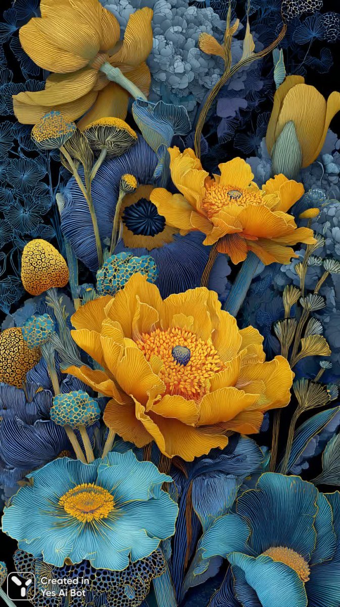Иллюстрация представляет собой причудливую композицию стилизованных цветов, выполненных в технике сложного орнамента и отличающихся разнообразием оттенков: от солнечного жёлтого до глубокого синего и элегантного чёрного. Мягкий, нейтральный фон позволяет деталям цветочных мотивов раскрыться во всей красе, создавая ощущение воздушности и лёгкости. Каждая деталь тщательно проработана, передавая тонкую эстетику и мастерство исполнения. Работа завораживает своей гармонией цветов и форм, пробуждая ассоциации с весенним садом или сказочным миром. Использование контрастных оттенков добавляет динамики и визуального интереса, делая композицию запоминающейся и привлекающей внимание. В целом, иллюстрация излучает позитив, радость и вдохновение, являясь прекрасным украшением любого пространства. Её изысканный стиль и деликатные детали делают её настоящим произведением искусства, способным подарить зрителю мгновения умиротворения и эстетического наслаждения. Это визуальный гимн красоте природы, переданный через призму творческого воображения художника