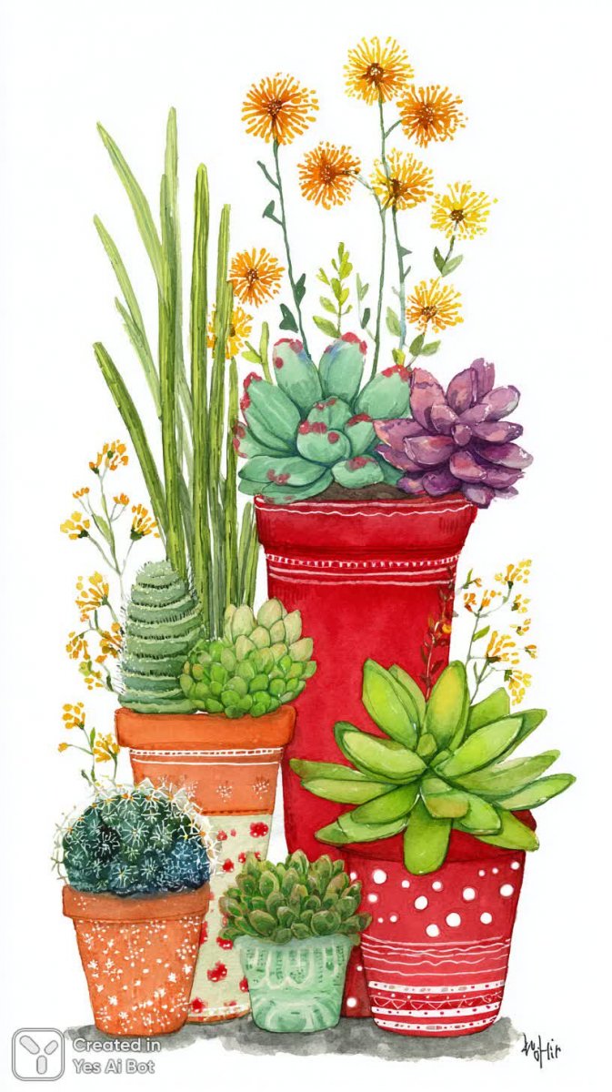 Очаровательная коллекция нарисованных в стиле Zentangle суккулентов в горшочках – это настоящее произведение фольклорного искусства. Яркие растения различных цветов и размеров аккуратно расставлены в сетчатом узоре на белоснежном фоне, создавая ощущение порядка и гармонии. Каждый горшок обладает своими неповторимыми размерами, что добавляет композиции индивидуальности и живости. Иллюстрации выполнены в милой и мультяшной манере, вызывая улыбку и располагая к себе. Нежные зеленые стебли листьев украшены желтыми цветами, придающими изображению свежесть и летнее настроение. Вся композиция пронизана игривым стилем, подчеркнутым мелкими точками, хаотично разбросанными по всему пространству. Это не просто изображение растений – это целая история, рассказанная с помощью линий и красок, наполненная теплом, уютом и позитивом. Такая коллекция идеально подойдет для создания уютной атмосферы в любом интерьере или станет прекрасным подарком для любителей комнатных растений и оригинальных художественных работ. Узор Zentangle придает работе особую глубину и текстуру, делая ее визуально привлекательной и запоминающейся. Кажется, будто эти маленькие суккуленты ожили на бумаге и готовы украсить ваш мир яркими красками и позитивными эмоциями. Это искусство в миниатюре, способное поднять настроение и добавить немного волшебства в повседневную жизнь