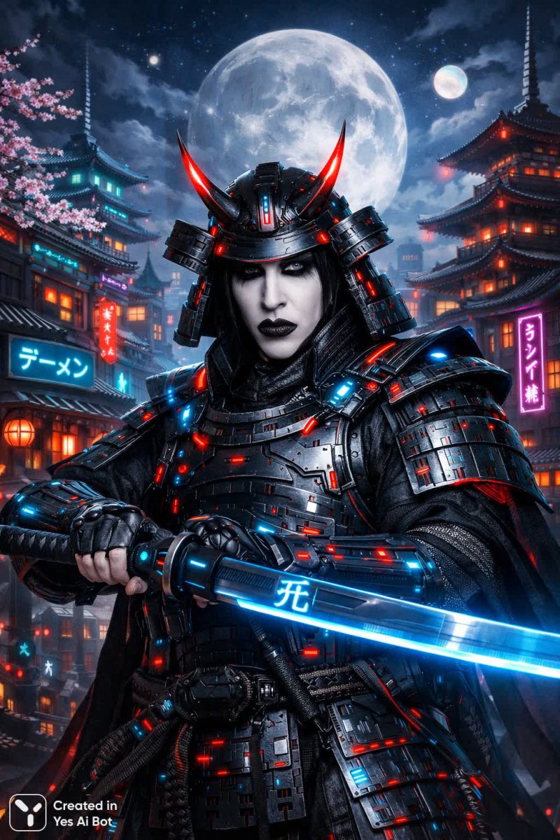 Ancient Japan. Marilyn Manson, dressed as a samurai, wears ancient samurai armor infused with neon futuristic technology. He holds a katana crafted from technological steel, the edges of the blade glowing blue, highlighting its shape. An ancient neon character is forged on the steel portion of the katana. The background depicts a typical ancient Japanese city with ancient temples, but technologically advanced, with neon signs attached to the walls of buildings. The city is immersed in Japanese trees, and a huge moon hovers overhead. A fantastical and futuristic work of art, based on past events, a masterpiece in which every detail is essentia...