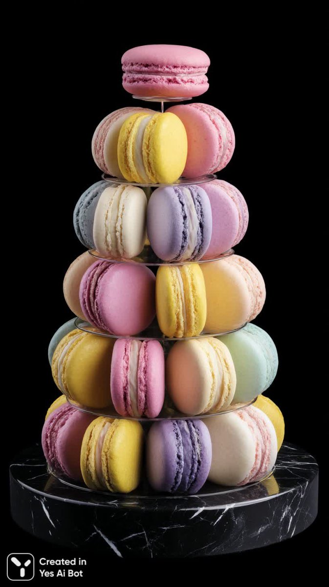 a vibrant array of multicolored macarons stacked artfully, featuring smooth textures and glossy finishes, resting on a sleek black marble surface, studio photo, photorealistic style, taken with a nikon z7 and a 85mm f/1.8 lens, focus on detail and vivid color contrast.