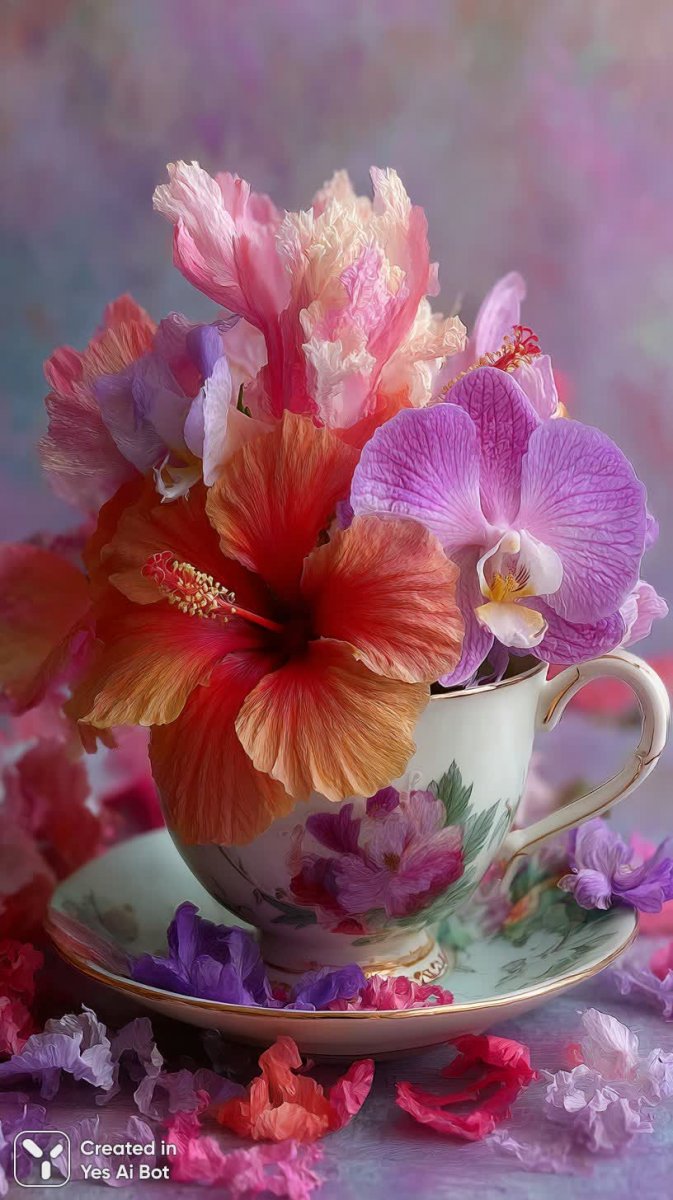 midjourney Яркий букет в чашке: тропическое великолепие и фотореализм. Картинка из нейросети Midjourney