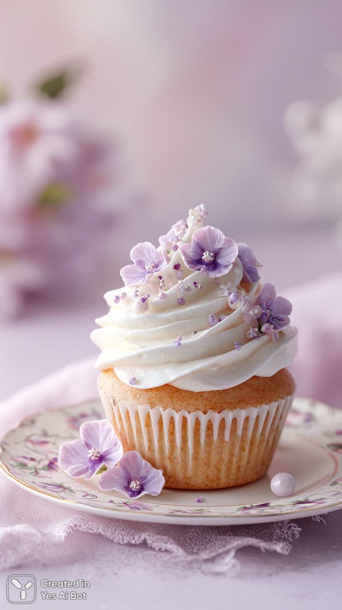 soft lavender cupcake with smooth, creamy frosting swirled on top, adorned with delicate edible flowers, positioned on a crisp white plate, BG is pastel purple, high-quality capture, studio photo, photorealistic style, Canon EOS R5 with 50mm lens.