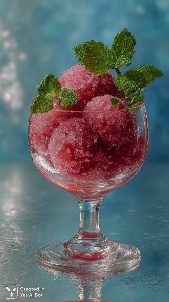 vibrant blue raspberry sorbet presented in a fine crystal glass, sprinkled with fresh mint, BG is soft white, sunlight casting gentle reflections, elegant and refreshing vibe, high-quality capture, studio photo, photorealistic style, Panasonic Lumix GH5 with 25mm lens.