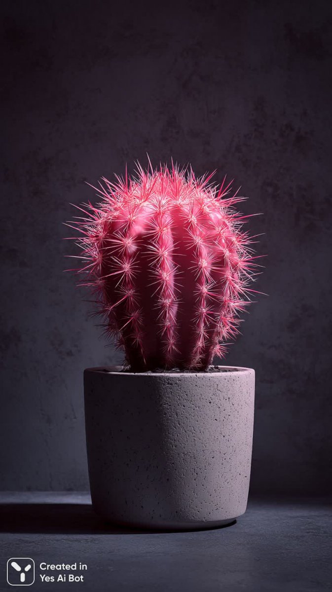 neon pink cactus with sharp, exaggerated spikes, placed on a polished concrete background, bright and striking colors contrasting with subtle textures, studio lighting highlighting its uniqueness, photorealistic style, captured using a nikon d850 and an 85mm lens.