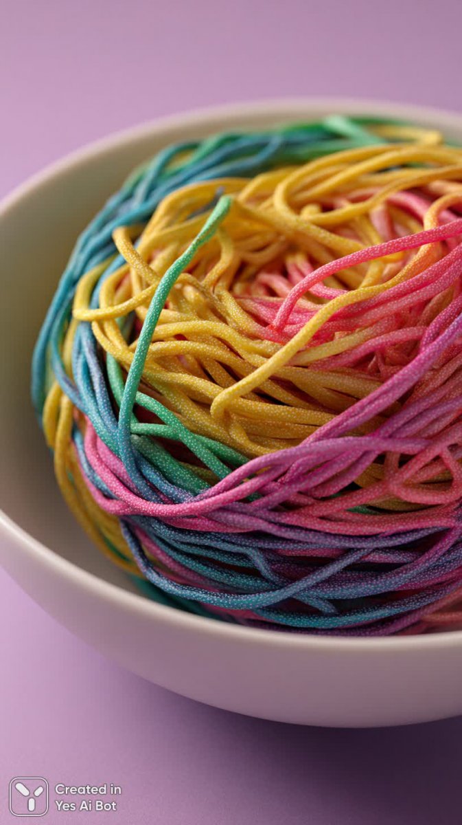 Изысканная кулинарная фантазия: аппетитная композиция из лапши спагетти, напоминающая яркое радужное гнездо. Пастельные оттенки красного, желтого, зеленого и синего переплетаются в причудливом узоре, создавая визуальный пир для глаз. Аккуратная подача на белоснежной тарелке подчеркивает естественную красоту блюда, а легкая посыпка свежих трав добавляет нотку аромата и свежести. Мягкий лавандовый фон создает атмосферу спокойствия и утонченности, позволяя всем деталям этой кулинарной скульптуры сиять в полной мере. Студийная фотография, выполненная в фотореалистичном стиле с использованием профессионального оборудования Canon EOS R и объектива 50mm, обеспечивает исключительное качество изображения и передает мельчайшие текстуры и детали лапши, трав и фона, позволяя зрителю почувствовать вкус этого необыкновенного блюда. Это не просто еда – это произведение искусства, воплощенное в гастрономической форме, сочетающее в себе эстетику и кулинарное мастерство для истинного наслаждения визуальным и вкусовым опытом. Погружение в мир ярких цветов и изысканных текстур обещает незабываемое впечатление от каждого элемента этой невероятной композиции