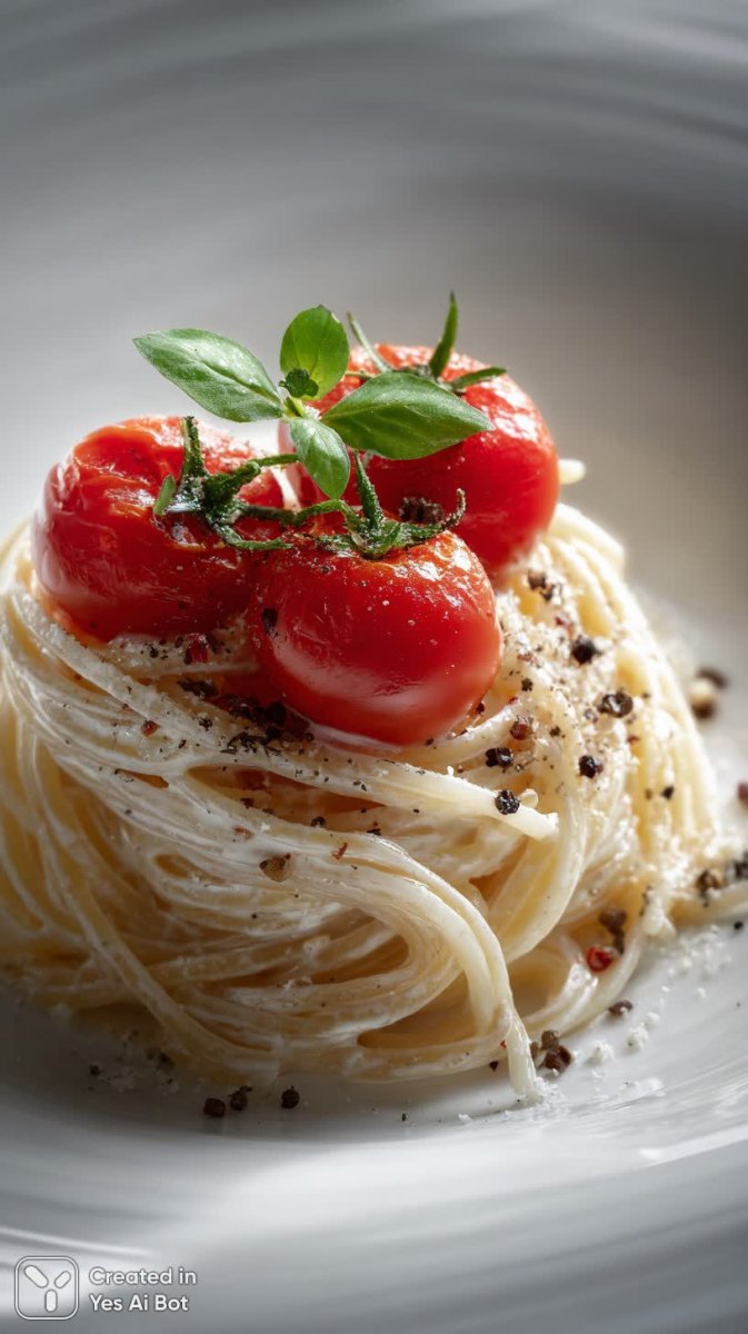 shiny cherry tomatoes scattered around creamy alfredo pasta, garnished with parsley and cracked black pepper, soft natural light highlighting the textures, background is a smooth white plate, studio photo, photorealistic style, taken with a nikon d850 and 35mm lens, creating a mouthwatering presentation.