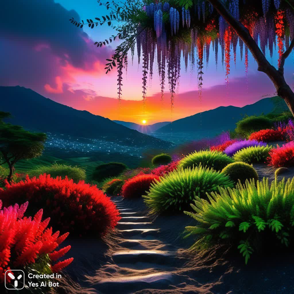 октановая цепь-серебро блеск ,огромное солнце Трубчатые кусты дерево лиловый глициния пористые горы мох изумрудный