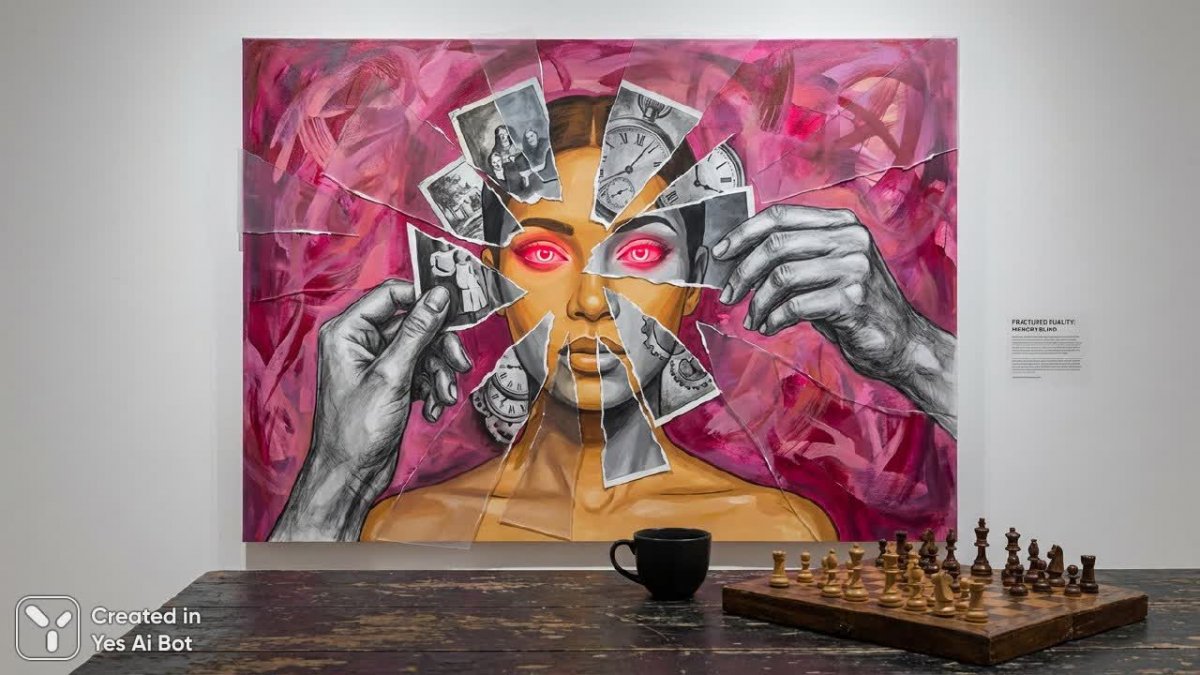 a captivating artwork merges fractured memories and duality, featuring a honey girl with neon scarlet eyes with colorblindness partially obscured by detailed hands in monochrome, set against a vibrant pink background that adds mystery, including a matte black coffee cup and chess.