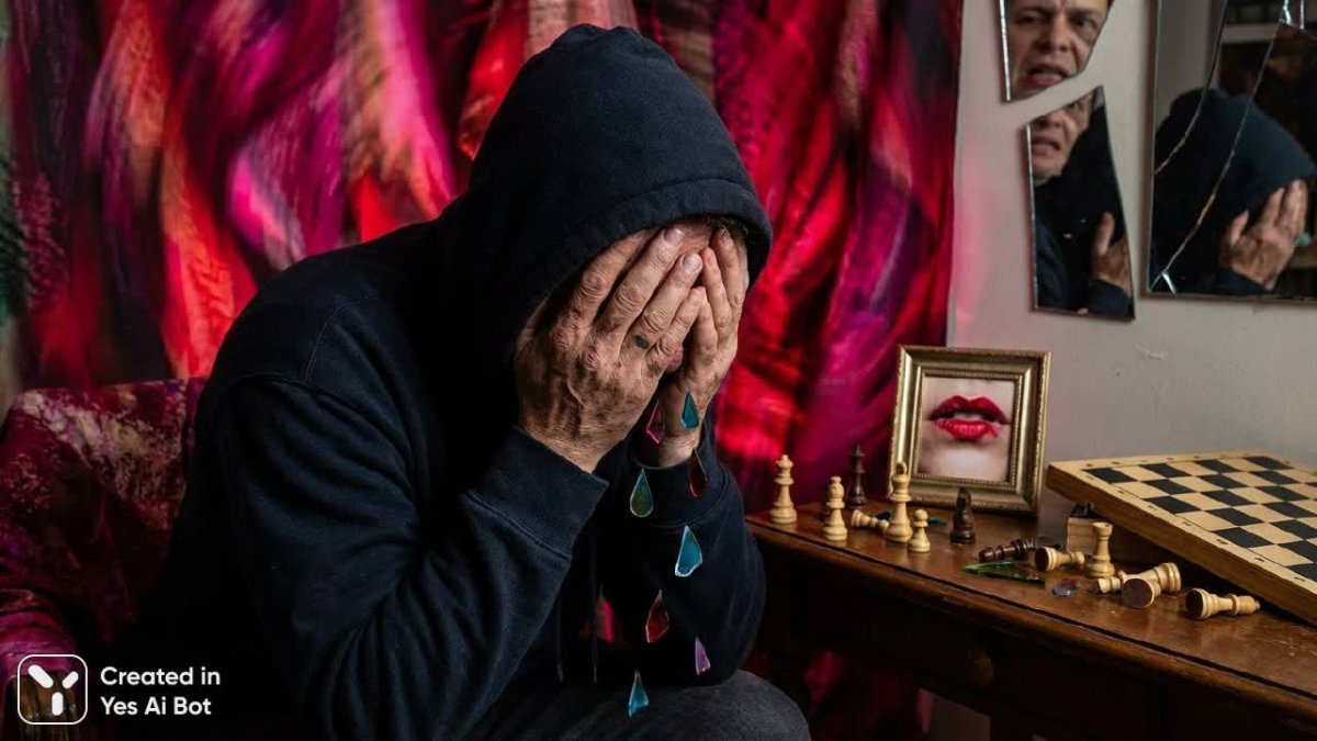 Изображение, сгенерированное нейросетью, демонстрирует сцену эмоционального кризиса, где фигура человека прячет лицо руками в попытке избежать нахлынувших чувств. Преобладающие красные и розовые тона создают атмосферу страсти и душевной боли, акцентируясь на стилизованных слезах, напоминающих витражи, что подчёркивает хрупкость момента. Детализированное изображение рук передаёт ощущение неотвратимости и возрастающего напряжения, символизируя потерю контроля над ситуацией. Зеркальные отражения фрагментируют личность, подчеркивая внутреннюю раздробленность под воздействием обстоятельств. Рядом располагаются алые губы, вероятно, олицетворяющие подавленные желания или внутренний конфликт, и шахматная доска, служащая метафорой жизненного пути с его непредсказуемостью и стратегическими решениями. Картина пронизана ощущением безысходности, но в то же время несёт в себе стремление найти опору в хаосе эмоций, являясь мощным отражением борьбы за самоидентификацию и внутреннее равновесие перед лицом потери контроля над собой. Вся композиция представляет собой сложное психологическое исследование хрупкости душевного состояния и глубины внутренних переживаний, заключенных в ярком калейдоскопе цвета и формы. Это визуальная интерпретация момента эмоционального краха, но одновременно и надежды на обретение внутренней гармонии.