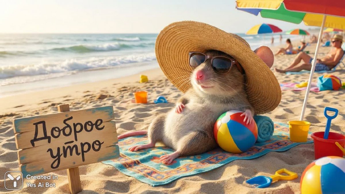 text on russian: "good morning!" an anthropomorphic mouse lounging on a colorful beach, wearing a wide-brimmed straw hat and dark sunglasses, its pink nose upturned while holding a vibrant beach ball, with gentle waves in the background.