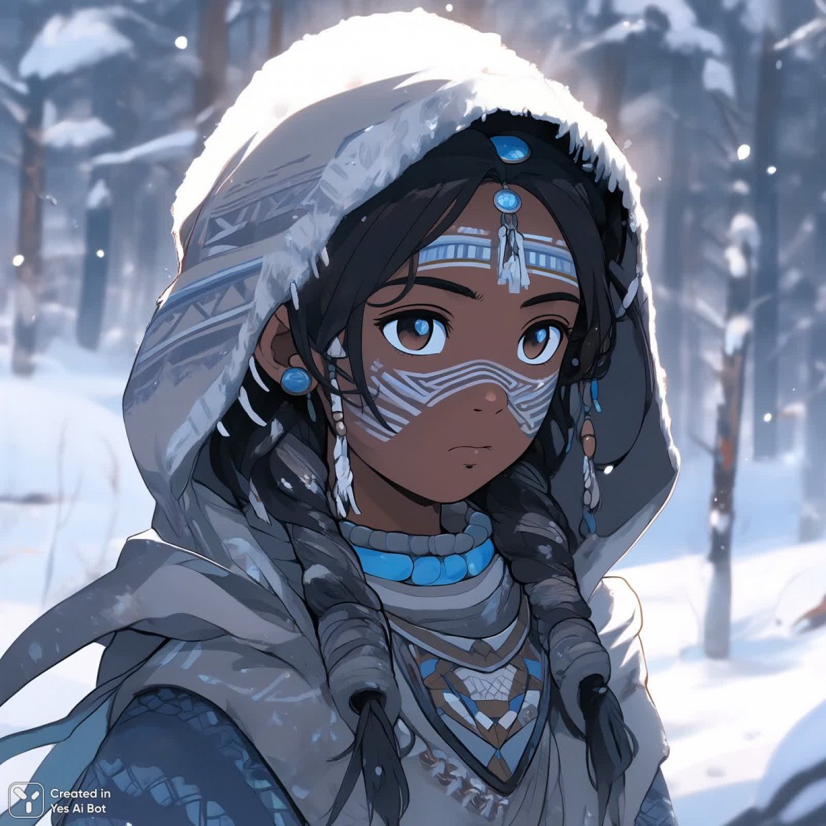 illustration of a young African girl with gray skin, wearing tribal face paint and a hood, glowing blue eyes, embodying adventure in a snowy landscape, styled like Akihiko Yoshida.