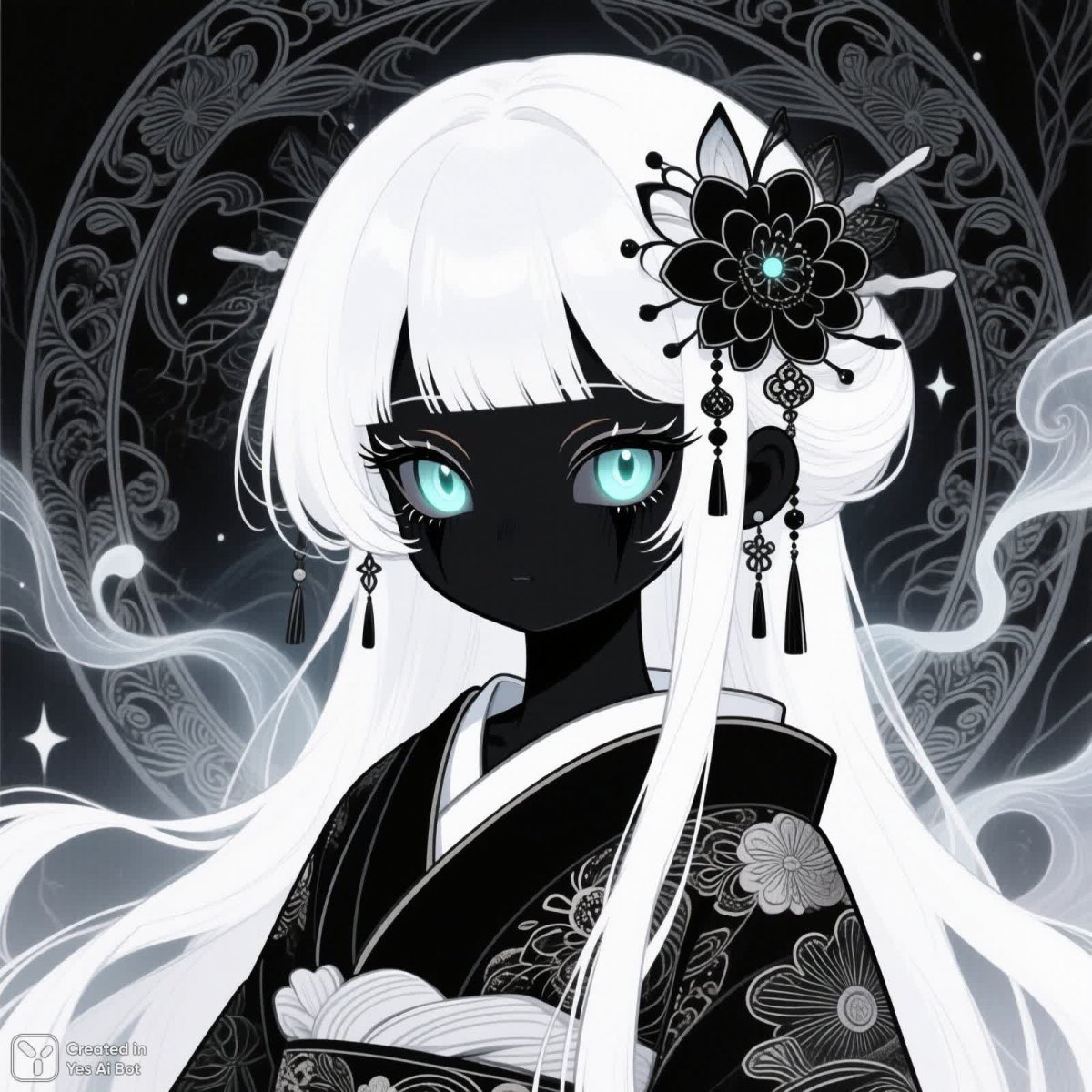 ink drawing of a white-haired doll in Japanese style with glowing eyes and elaborate black makeup, surrounded by ethereal patterns, creating an eerie atmosphere, inspired by dark fantasy and art nouveau.