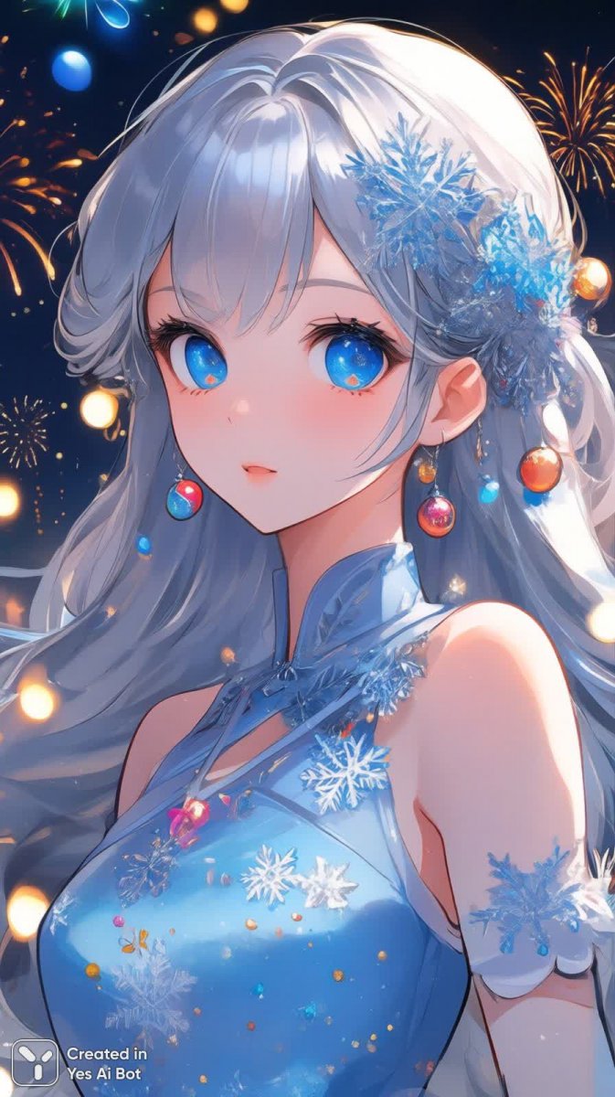 Зимняя сказка: Новогодняя иллюстрация с серебристыми волосами и голубыми глазами - Пример изображения из нейросети Qwen Image