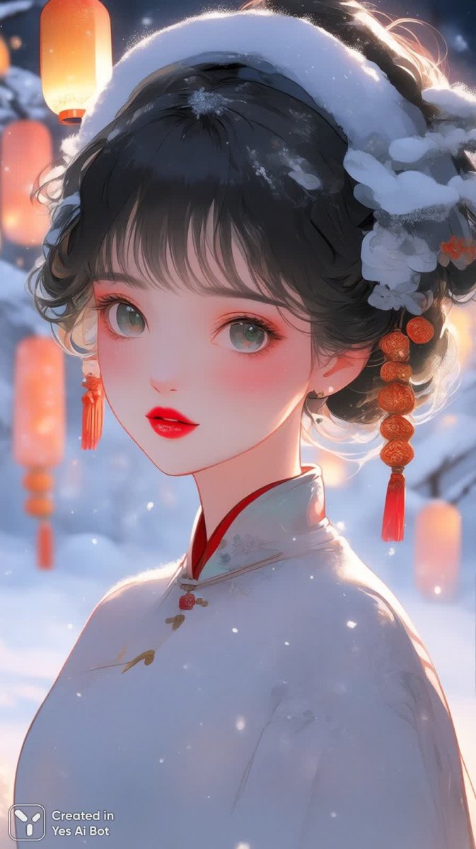 ink drawing, illustration of an ethereal girl with bright red lips and green eyes, wearing a traditional new year dress adorned with intricate designs, standing in a snowy forest with softly glowing lanterns around her, capturing the essence of a winter festival in soft pastel colors.