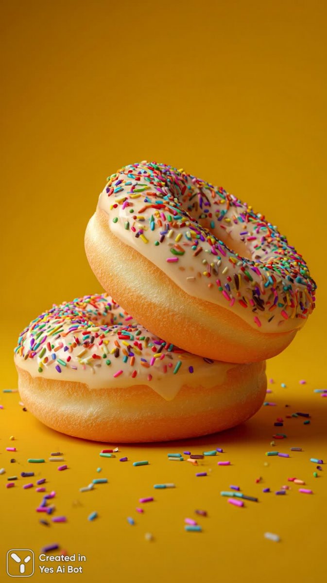 Две круглые пончики, умело стилизованные под яркие пляжные мячи, создают атмосферу беззаботного летнего веселья. Искусно разбросанные разноцветные посыпки добавляют игривости и динамики этой аппетитной композиции. Фон выполнен в солнечном желтом оттенке, что усиливает ощущение тепла и радости, ассоциирующегося с пляжным отдыхом. Дизайн выдержан в минималистичном стиле, акцентируя внимание на форме и цвете пончиков, а яркое студийное освещение подчеркивает их текстуру и аппетитность. Веселая композиция призывает к улыбке и создает позитивное настроение, словно приглашая насладиться сладким угощением в солнечный день. Эта работа – прекрасный пример сочетания кулинарного искусства и визуального дизайна, демонстрирующий простоту и элегантность в деталях. Яркие цвета и игривый характер изображения делают его идеальным для использования в рекламе кондитерских изделий или в качестве декоративного элемента интерьера, добавляющего нотку легкости и позитива в любое пространство. Небольшая группа пончиков идеально подходит для создания визуального эффекта, который привлекает внимание и вызывает положительные эмоции у зрителя