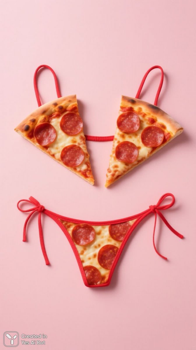 Изображение, созданное искусственным интеллектом, представляет собой необычное сочетание кулинарии и моды: два аппетитных треугольных кусочка пиццы с пепперони стилизованы под верхнюю часть бикини. Красные нити, имитирующие перевязки, добавляют игривости и визуальной привлекательности этой неожиданной композиции. Нежный пастельно-розовый фон создает атмосферу легкости и подчеркивает минималистичный подход к дизайну.