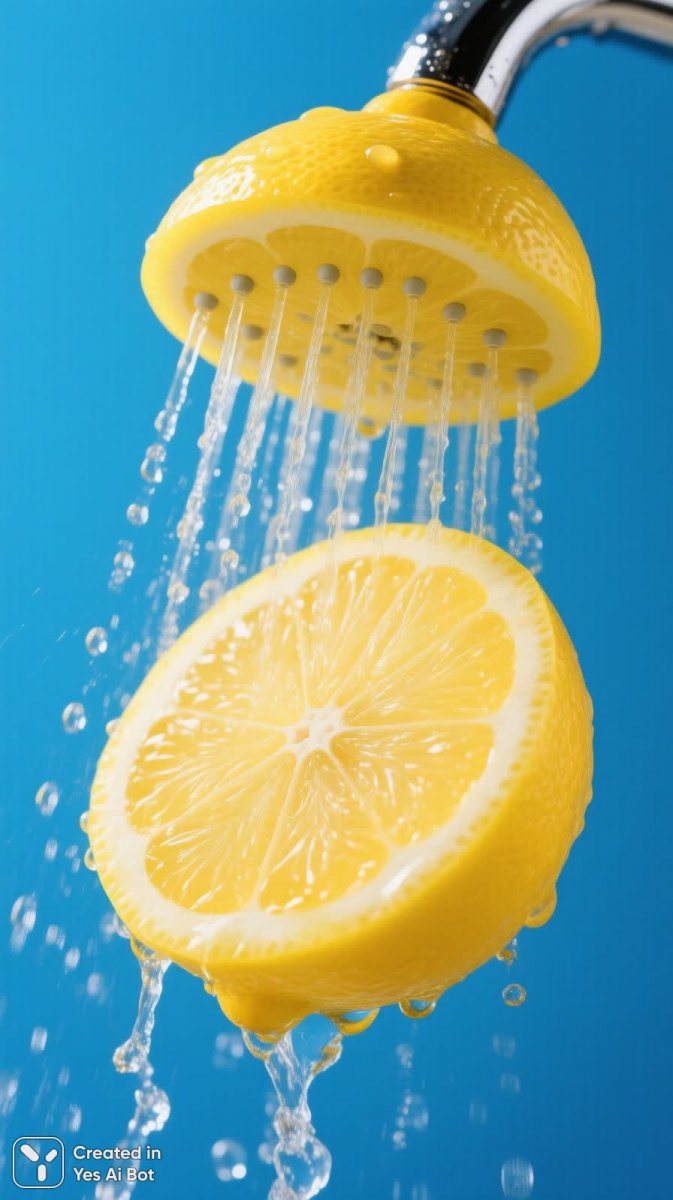a vibrant surreal scene featuring a lemon half transformed into a shower head, water cascading down in fine streams, crisp yellow and blue contrasting colors.
