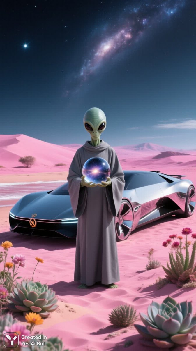 soviet union, professional photo an alien wearing gray robes, holding a crystal ball with galaxies inside, standing in front of a futuristic concept car made of glossy metal parked on vibrant pink mars beach, flowers and succulents growing amidst sand dunes under starry milky way, digital art style, high-definition, hr photography.