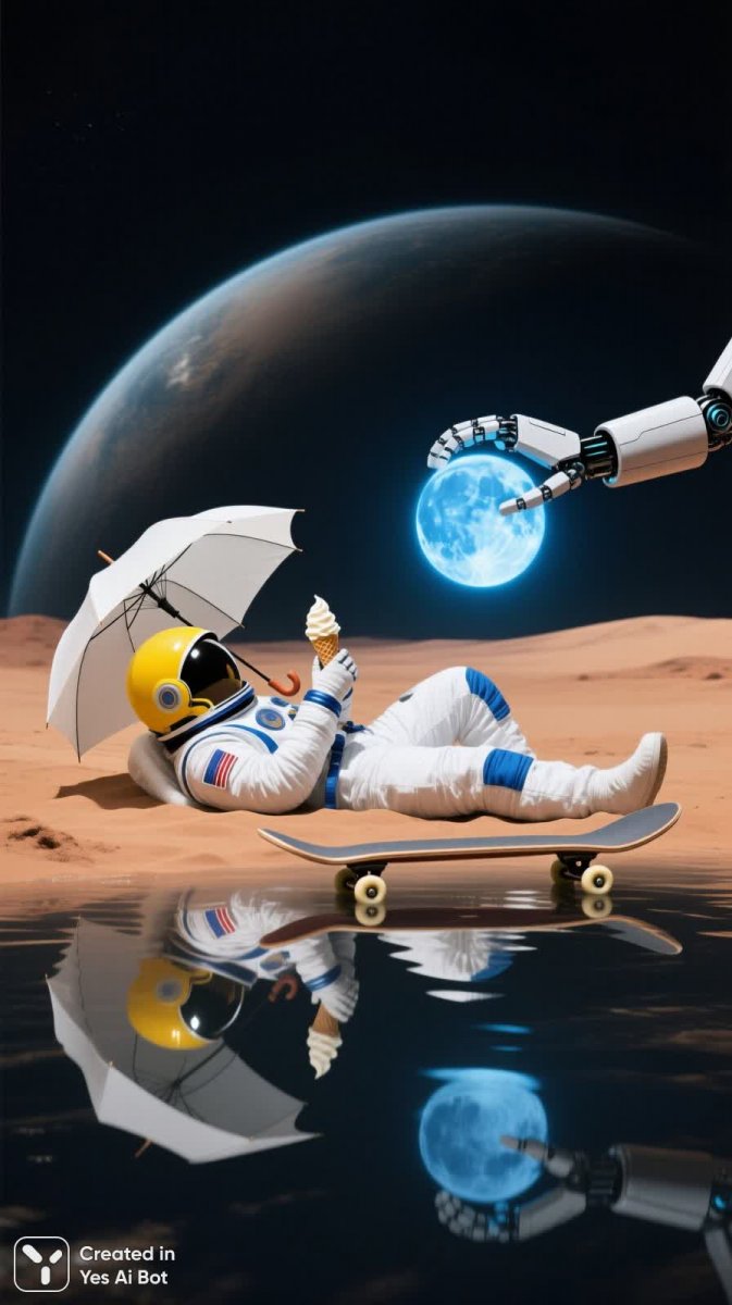 soviet union, professional photo an astronaut in white spacesuit lying on mars sand, holding umbrella eating ice cream against a simple background with purple planets behind him, robot hand holds glowing blue moon in dark mysterious water surface reflection, floating space skateboard with yellow helmet wearing a white and blue suit, hr photography.