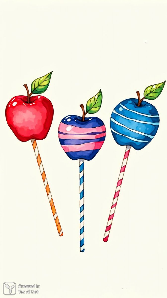 Яркое трио яблок на леденцах: игривый рисунок в стиле фэнтези. Генерация из нейросети Flux.1