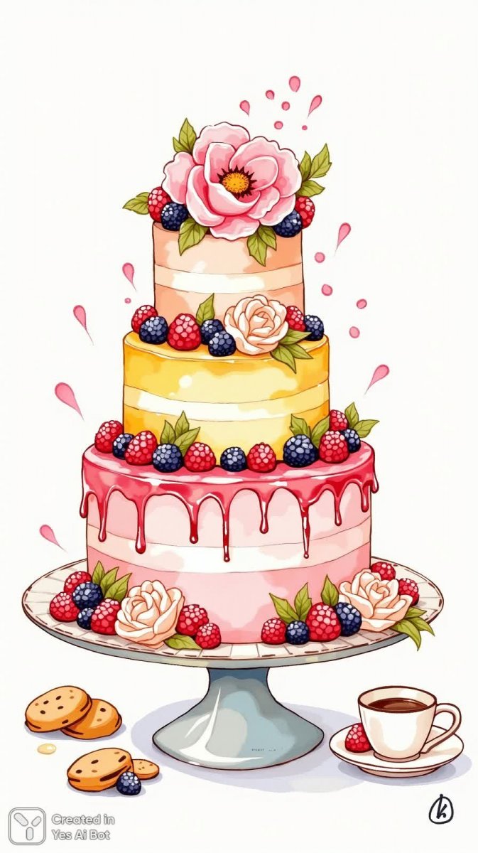 5. ink drawing, playful illustration of a three-tiered cake with pastel layers of pink and yellow frosting, large floral decoration on top, adorned with fresh berries like raspberries, set against a white backdrop with scattered cookies and coffee cup, whimsical and playful style.