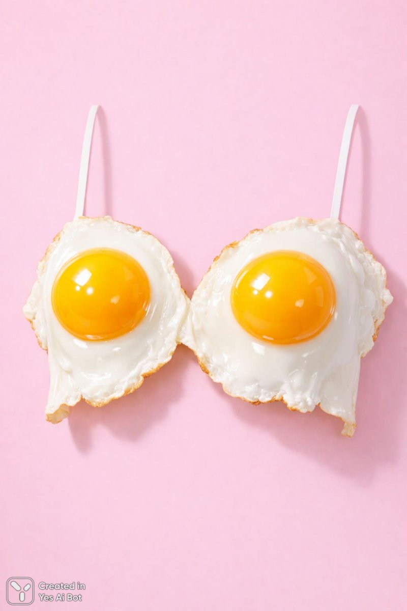 2. a surreal bikini top made of two fried eggs with glossy yolks, pastel pink background, minimalistic style, bright studio lighting, imaginative arrangement, high detail.