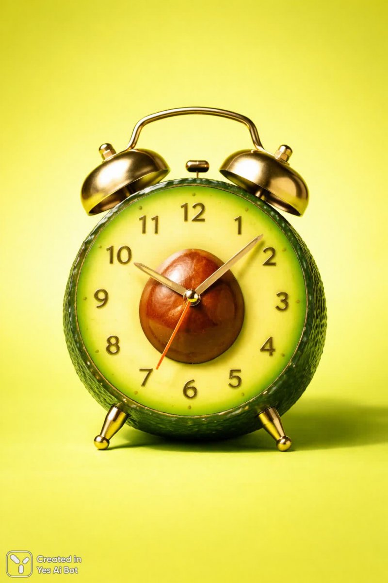 Необычный будильник с авокадо в ярком свете студии - Пример работы нейросети Sora Image