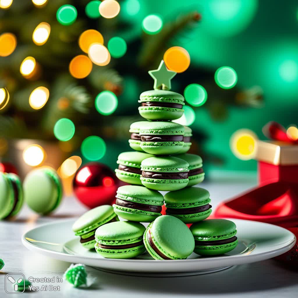 christmas tree made of green and mint macarons stacked in a cone shape on a white plate, festive holiday setup, soft warm lighting, bokeh Christmas lights in background, food photography style, high detail, bright stock photo, Super-Resolution, Commercial photography, 8K, UHD.