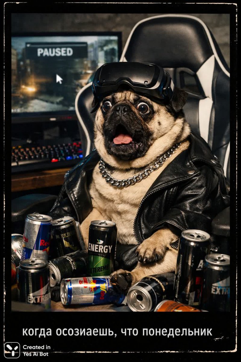 1. Photo on film, black frame, russian text in white letters on the black frame: "When you realize it's Monday", a shocked pug wearing a VR headset, sitting on a gaming chair surrounded by energy drink cans, with a computer screen showing a paused game with a blinking cursor.
