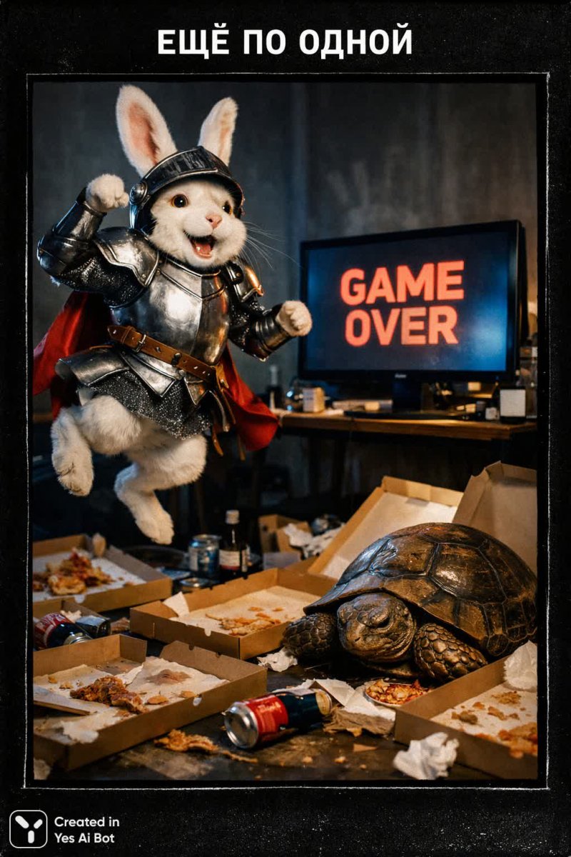 Забавный и сюрреалистичный снимок на пленку запечатлел момент после напряженной игровой сессии. В центре внимания – оживленный кролик, облаченный в рыцарские доспехи, готовый к новому раунду игры, несмотря на поражение. Его энергия контрастирует с унылым видом монитора, на котором красуется надпись 'Game Over'. Черная рамка фотографии украшена белым русским текстом 'Еще один раунд', добавляя ей уникальный шарм и загадочность. Вокруг разбросаны пустые коробки из-под пиццы – очевидный признак продолжительной битвы за виртуальную победу. В углу композиции, словно наблюдатель за этим хаосом, расположился сонный черепаха, пытающийся найти немного покоя среди бушующей страсти к играм. Фотография передает атмосферу беззаботной азартов, дружеского соперничества и нежелания сдаваться, даже после поражения. Это яркий пример сочетания юмора, ностальгии по аналоговой фотографии и отсылок к современной игровой культуре, создающий неповторимую визуальную историю. Камера запечатлела мимолетный момент, полный энергии и очарования, который хочется рассматривать снова и снова, разгадывая все детали этого необычного сюжета. Изображение вызывает улыбку и ощущение тепла, напоминая о радостях совместного времяпровождения и неиссякаемом стремлении к новым достижениям