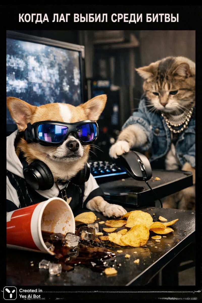 2. Photo on film, black frame, white russian text in letters on the black frame: "When the lag hits mid-battle," a frustrated chihuahua wearing gamer goggles, staring at a frozen screen, with a spilled cup of soda and scattered chips around, while his best friend, a distracted cat, is busy knocking over a mouse.