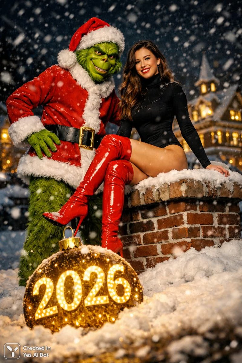 the grinch in red santa suit with green furry hands, standing next to cheerful young woman wearing black turtleneck bodysuit and red knee-high boots, sitting on snow-covered brick chimney, gold glowing ornament with 2026 text in foreground, dark winter night, swirling snowflakes, upscale winter architecture in BG, playful festive mood, full body, high photorealism, sony a7r iv, 35mm f1.4 lens, low angle, cinematic style.