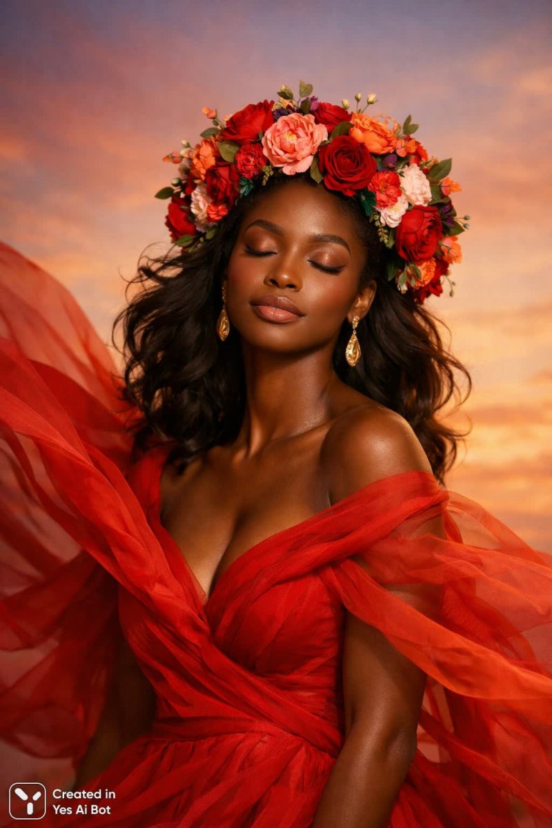 Восхитительный портрет молодой женщины с темной кожей, увенчанной пышным цветочным венком. Она облачена в струящееся красное шифоновое платье, которое изящно трепещет на ветру, создавая ощущение легкости и движения. Ее глаза нежно закрыты, выражая безмятежность и внутреннюю гармонию. Фон выполнен в мягких тонах заката, добавляя изображению тепла и романтики. Использование студийного освещения подчеркивает насыщенность цветов и создает объемный эффект. Снято на камеру Nikon D850 с объективом 85mm f/1.4 под углом уровня глаз, что позволяет зрителю ощутить непосредственность момента и установить эмоциональную связь с моделью. Изображение отличается исключительной детализацией, выполненной в стиле beauty editorial – элегантном и утонченном, подчеркивающем красоту и грацию модели. Это произведение искусства является воплощением женственности, спокойствия и природной красоты, приглашая зрителя насладиться моментом тишины и созерцания. Камера запечатлела не просто образ, а целую историю – историю о внутренней силе, умиротворении и гармонии с собой и окружающим миром. Портрет излучает тепло и позитив, оставляя после себя ощущение покоя и вдохновения