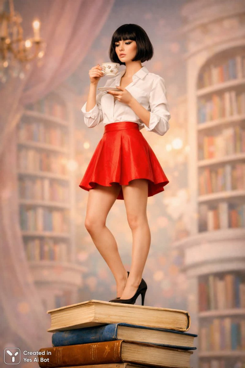Завораживающий портрет юной девушки в необычном образе, созданный в стиле сюрреалистичной моды. Ее гладкая стрижка боб цвета воронова крыла идеально сочетается с яркой красной юбкой и стильной полосатой рубашкой, а смелый макияж подчеркивает выразительность взгляда. Девушка уверенно стоит на высокой стопке массивных книг, словно покоряя мир знаний. В руках она нежно держит изящную чашку для чая, создавая атмосферу мечтательности и утонченности. Фон – сказочная библиотека в пастельных тонах, окутанная мягким кинематографическим светом, добавляет изображению волшебства и загадочности. Фотография выполнена на профессиональную камеру Canon EOS R5 с объективом 85mm f/1.2, что обеспечивает потрясающую резкость и красивое размытие фона. Немного сниженный угол съемки придает композиции динамичность и подчеркивает силуэт модели. Вся работа выдержана в стиле editorial, что делает ее не только визуально привлекательной, но и рассказывает историю о молодости, красоте, интеллекте и стремлении к мечтам. Это настоящее произведение искусства, сочетающее в себе элегантность, креативность и техническое совершенство. Кажется, будто время остановилось, позволяя зрителю полностью погрузиться в эту неземную атмосферу