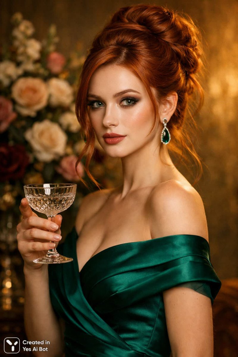 5. stunning portrait of young woman with long red hair in elegant updo, wearing deep emerald green satin dress, holding a delicate crystal glass, elaborate floral arrangement in background, warm golden lighting, canon eos r5, 85mm f/1.2 lens, eye-level angle, fashion editorial style, ultra sharp, rich textures.